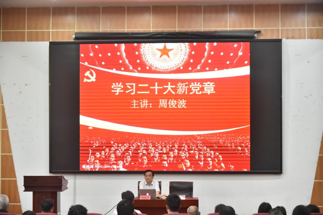 会上,周俊波书记首先对人性、德性和党性进行了解释并生动直观地讲解了三者之间的逻辑关联性。然后聚焦学习贯彻党的二十大精神这一核心内容和主线,从深刻认识党章的重要地位和作用、历届党章的回顾、全面掌握二十大党章修改的主要内容、准确把握学习贯彻新党章的实践要求进行了深入解读。周俊波书记的授课主题鲜明、内容丰富、案例详实、深入浅出,引导全校党员和教职工深入、全面、系统地理解掌握新党章内容。