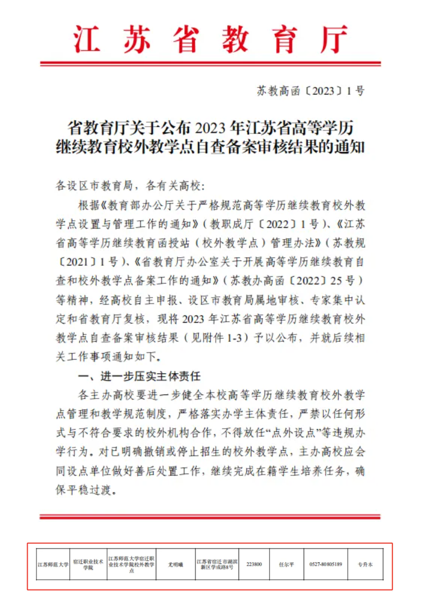 江苏省教育厅根据《教育部办公厅关于严格规范高等学历继续教育校外教学点设置与管理工作的通知》(教职成厅〔2022〕1 号)、《江苏省高等学历继续教育函授站(校外教学点)管理办法》(苏教规〔2021〕1 号)、《省教育厅办公室关于开展高等学历继续教育自查和校外教学点备案工作的通知》(苏教办高函〔2022〕25 号) 等精神,经设区市教育局属地审核、专家集中认定、省教育厅复核,批准我院正式成为江苏师范大学本科学历教育校外教学点,并发文公布,报国家教育部备案。此次备案成功,为十大正规网赌软件app与江苏师范大学搭建了更为紧密的合作桥梁。作为校外教学点,十大正规网赌软件app将承担起部分本科学历继续教育的教学任务,为广大学员提供更加丰富且优质的教学资源以及专业的学习指导,助力学员们实现知识的提升与个人的成长。