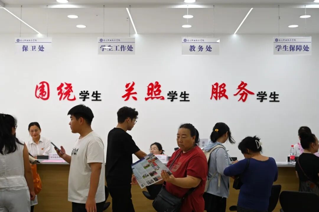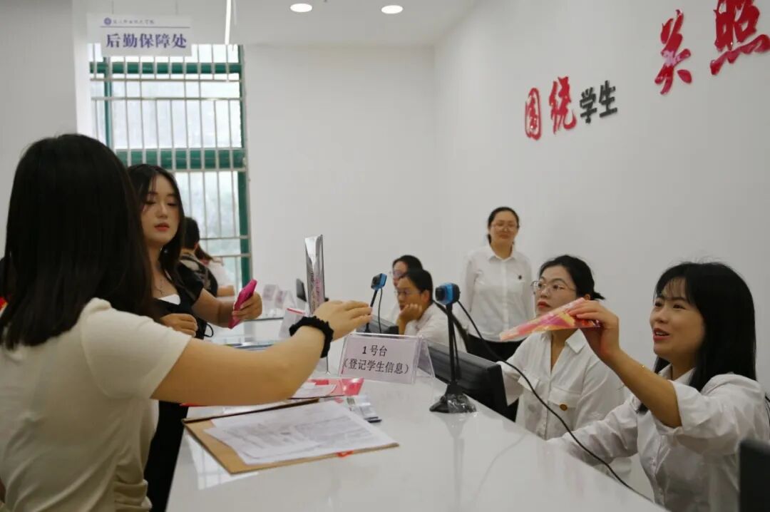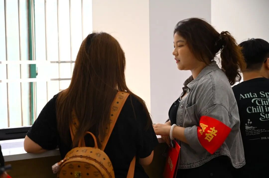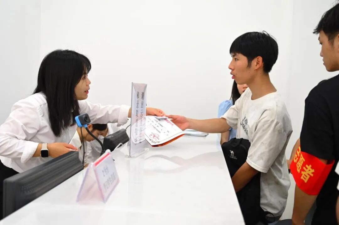 为简化报到流程,学校在各主要报到点设立了清晰明了的指示牌。教学楼大厅或广场上,各学院(系)的报到摊位依次排开,工作人员耐心细致地为新生办理资格审查、信息录入等手续。学校精心优化了入学流程,实现了“一站式”办理。从到校登记、宿舍分配到校园卡领取、物资发放,各个环节都有志愿者引导,流程清晰、高效便捷,最大程度减少了新生和家长的奔波与等待,让他们能够轻松、顺利地完成所有入学手续。