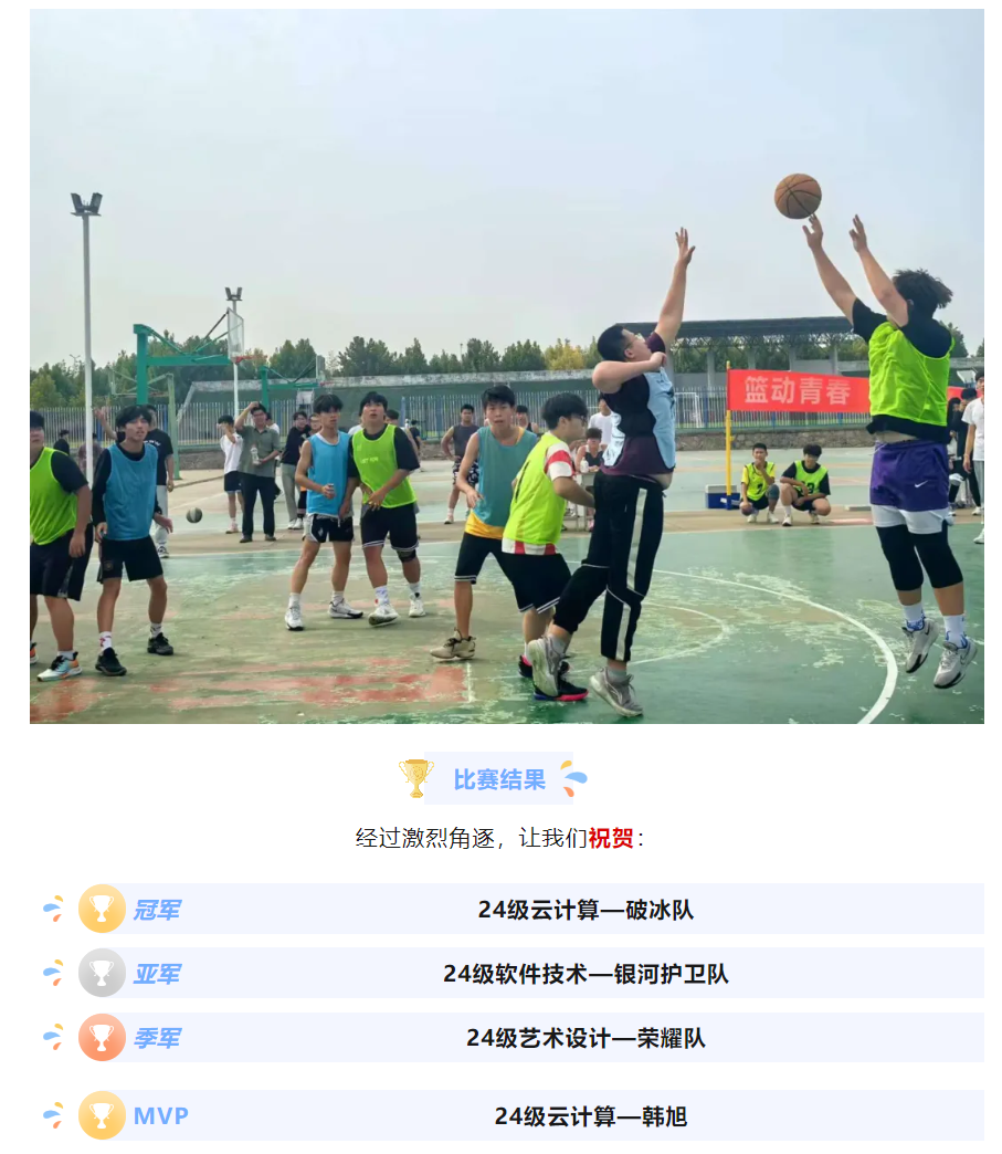 本次我院“迎新杯”篮球赛在同学们的欢声笑语中圆满结束。此次活动不仅丰富了同学们的课余生活,同时也提高了同学们的身体素质和团体合作能力。“迎新杯”篮球赛的成功举办为新生们提供了一个展示自我、锻炼身体的平台,也为学院的文体生活注入了新的活力。